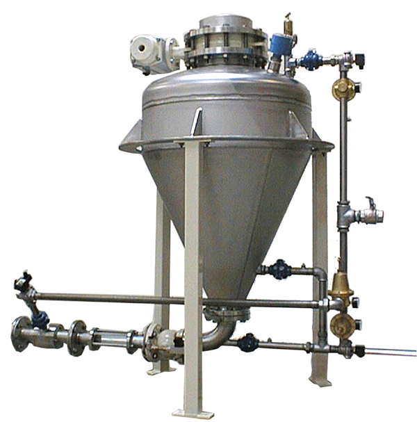 打開進氣閥,壓縮空氣進入泵體上部及底部,上部加壓,下部空氣擴散後穿過流化床,使物料呈流態化狀態,同時泵體內壓力上升;