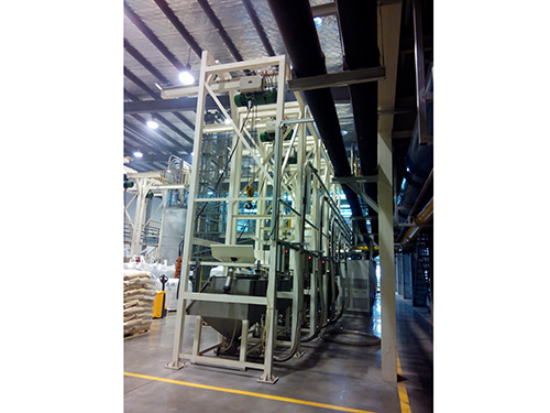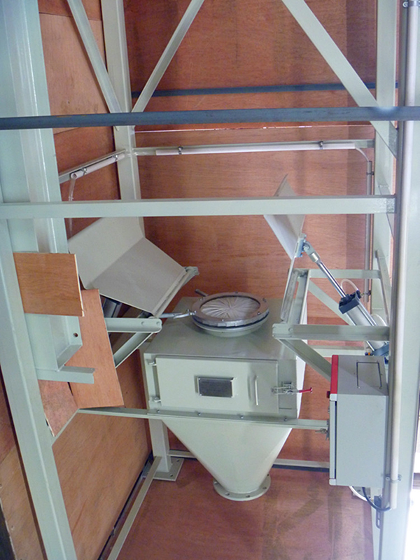下料倉:上部配有圓形變徑可使物料袋下料口更好的對準料倉中心並加快物料下落速度。中間部分配有手動解繩的工作門。下部與目標倉法蘭連接(也可增加橡膠軟連接與目標法蘭對接)。