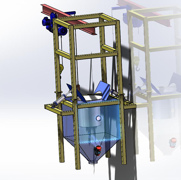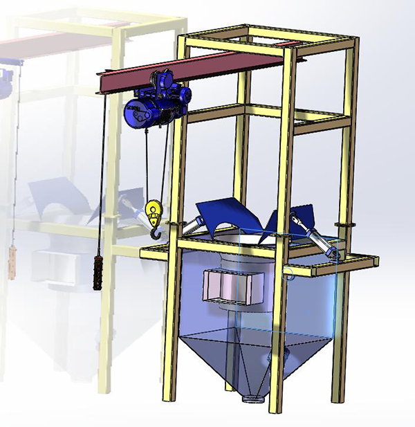下料倉:上部配有圓形變徑可使物料袋下料口更好的對準料倉中心並加快物料下落速度。中間部分配有手動解繩的工作門。下部與目標倉法蘭連接(也可增加橡膠軟連接與目標法蘭對接)。對比A型拆包機B型拆包機在此部位加大了料倉的容積並預留了除塵引風口。